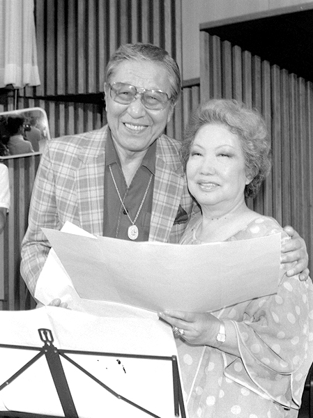 レコーディングするディック・ミネさん(左)と淡谷のり子さん(昭和58年)/(C)共同通信社