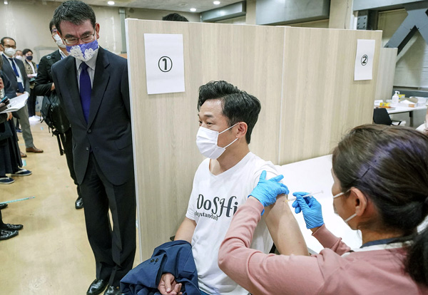 ワクチン接種を受ける吉本興業のお笑いコンビ「ペナルティ」のヒデ氏(央)と視察する河野太郎ワクチン担当相=左(C)共同通信社