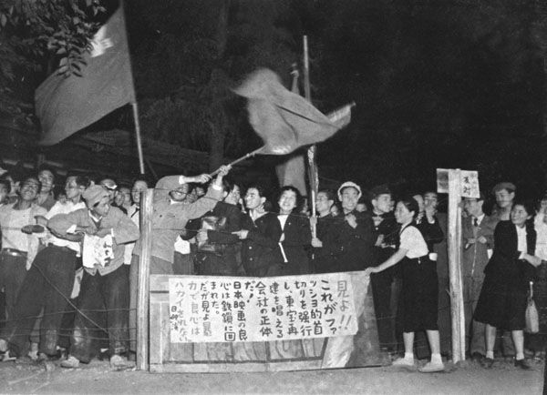 気勢を上げる日本映画演劇労働組合(日映演)の組合員ら=1950年5月25日、東京・世田谷の東宝砧撮影所(C)共同通信社