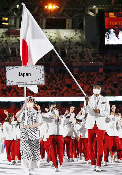 開会式で、旗手の八村塁を先頭に入場行進する日本選手団(23日、国立競技場)/(C)共同通信社