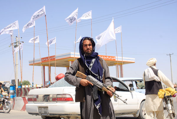 アフガニスタンを制圧したタリバン戦闘員とタリバン旗(C)ロイター