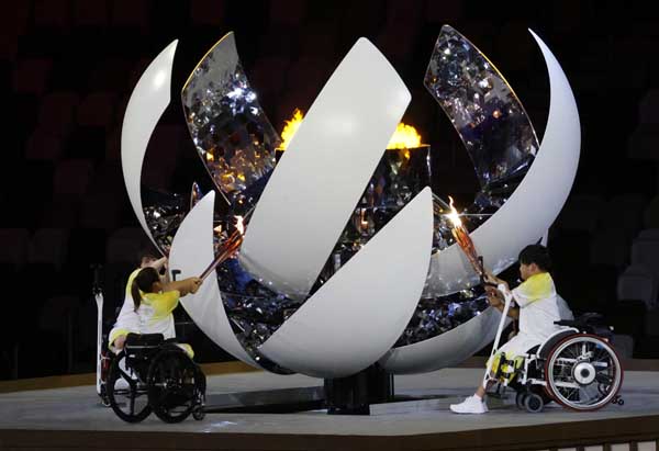 開会式で聖火をともす上地結衣ら(C)日刊ゲンダイ
