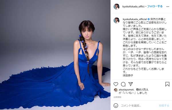 深田恭子がノースリーブドレス姿で芸能活動再開を報告 突然の休養から3カ月