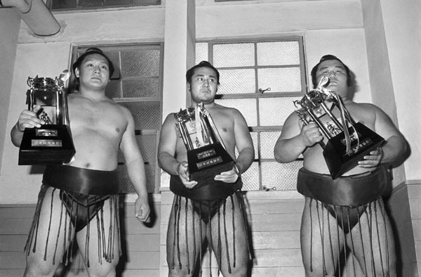 1974年、夏場所(左から)技能賞の増位山、敢闘賞の豊山、殊勲賞の荒瀬(C)共同通信社