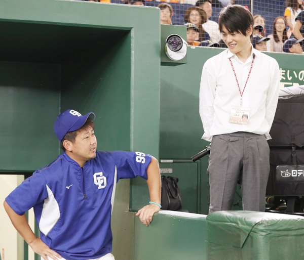 上重聡アナ(右)と談笑する松坂(C)日刊ゲンダイ