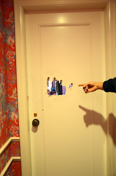 犯人にドアを破られた寝室(撮影)吉田隆