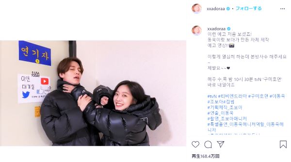 撮影の合間にふざけあうイ・ドンウク(左)とチョ・ボア(チョ・ボアのインスタグラムより)