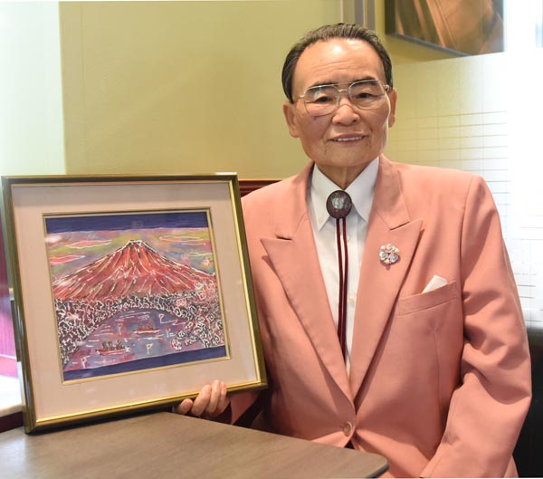 自身の作品「赤富士」と(C)日刊ゲンダイ