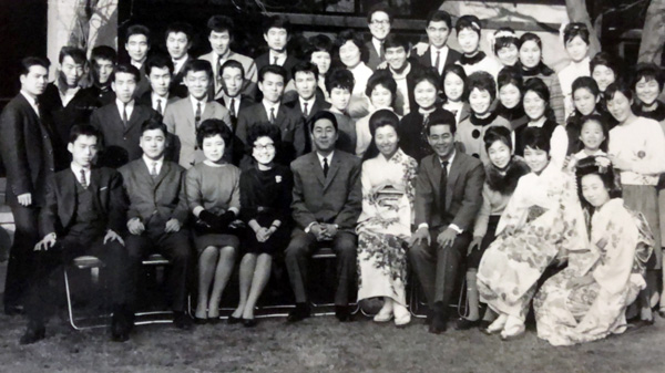 「上原げんと歌謡教室」新年会の写真。2列目左から3人目のグレーのスーツが松山まさる時代の五木ひろし(写真提供・山崎照朝氏)