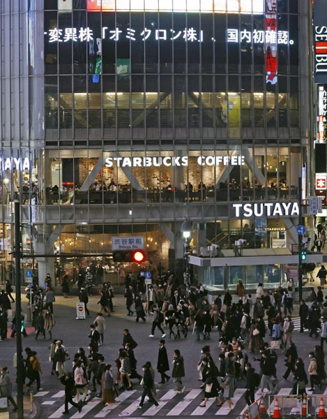 国内で「オミクロン株」が初確認されたことを伝える電光ニュース(C)共同通信社