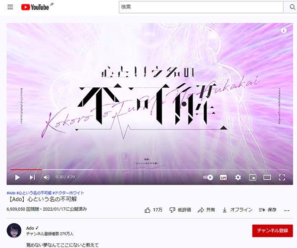 “月10”ドラマ「ドクターホワイト」の主題歌に採用された新曲「心という名の不可解」(Adoの公式ユーチューブから)