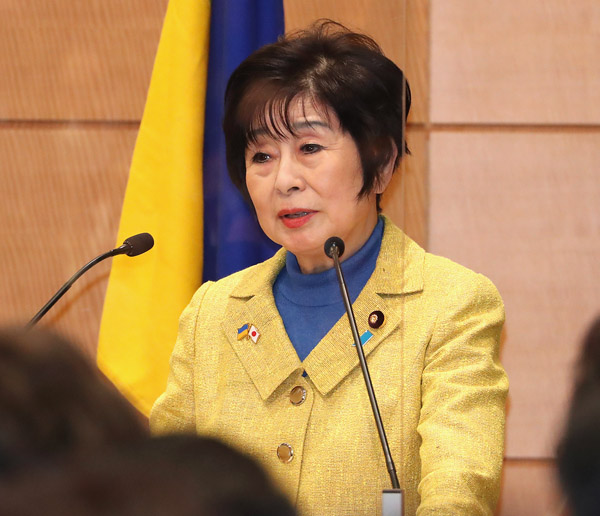 ウクライナの国旗カラーに身を包み…(山東昭子参院議長)/(C)JMPA