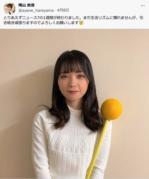 NHK「ニュース7」の新お天気キャスター・晴山紋音(本人のツイッターから)