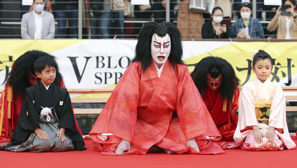 道頓堀川の船上で口上を述べる市川海老蔵さん。右は長女市川ぼたんさん、左は長男堀越勸玄君(C)共同通信社