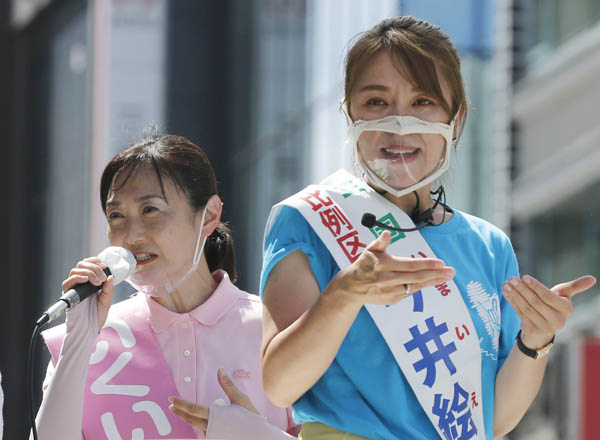 選挙演説をする生稲晃子(左)と今井絵理子(C)日刊ゲンダイ