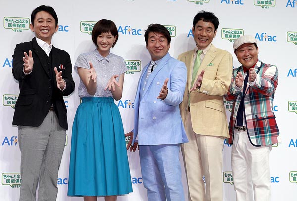 (左から)有吉弘行、本田翼、ダチョウ倶楽部(右端が上島竜兵さん)/(C)日刊ゲンダイ