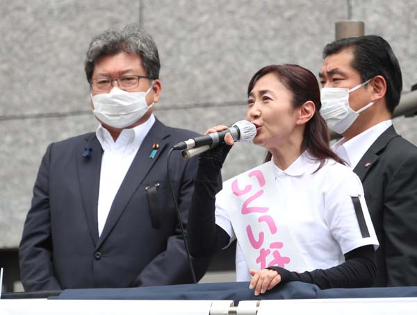 安倍元首相が亡くなり、選挙最終日となった9日、喪章をつけて演説する生稲晃子候補と、応援に駆けつけた萩生田光一経産相(当時)/(C)日刊ゲンダイ
