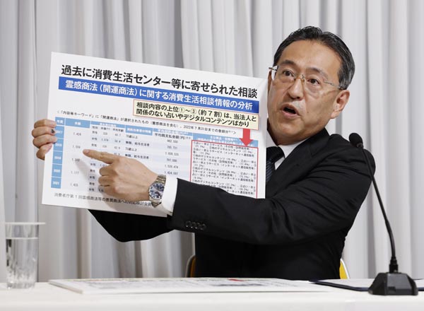 世界平和統一家庭連合(旧統一教会)の教団本部で記者会見する勅使河原秀行改革推進本部長(C)共同通信社