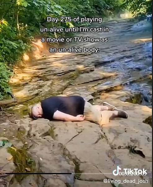 小川で死体を演じるジョシュさん(ジョシュさんのティックトックから)