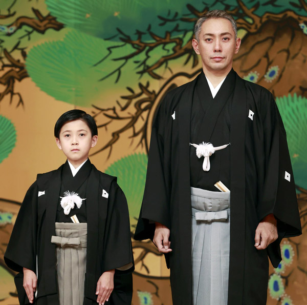 市川海老蔵(右)と息子の堀越勸玄くん(C)共同通信社