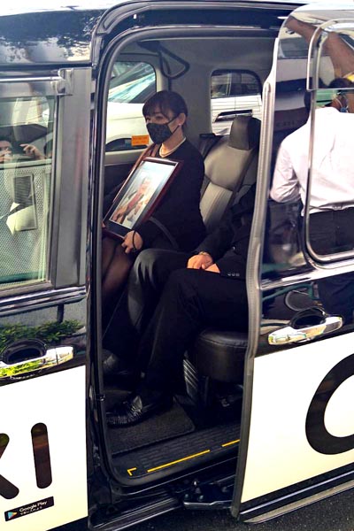 タクシーで斎場を後にする仲本工事さんの妻・三代純歌(C)日刊ゲンダイ