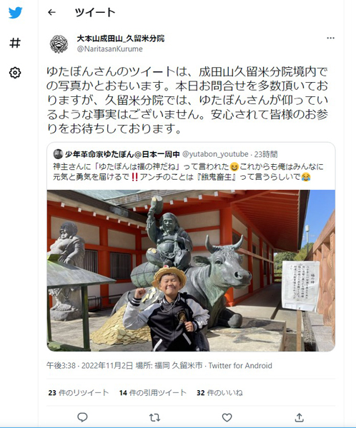 (「大本山成田山_久留米分院」の公式ツイッターから)