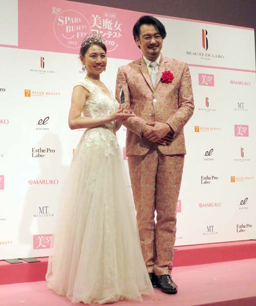 ゲスト審査員の純烈の小田井涼平(51)とグランプリの木曽千草さん(54)(C)日刊ゲンダイ