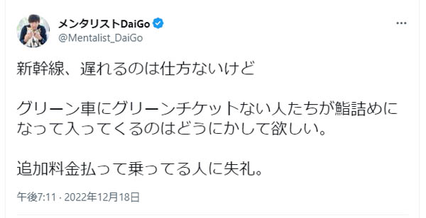 メンタリストDaiGoがルール無視の新幹線客にSNSで激怒も賛否 見え隠れする炎上騒動の余波
