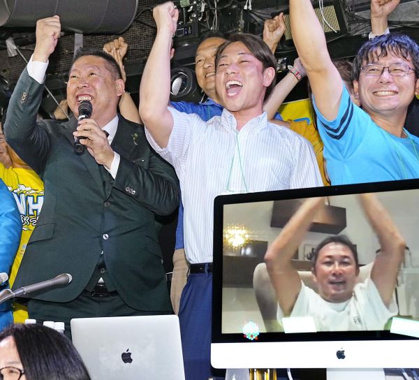 2022年7月の参院選比例代表で当選が決まったガーシー氏(画面)と喜ぶNHK党の立花党首(左)ら(C)共同通信社