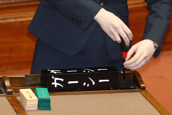 散会後、職員の手により速やかに取り外されるガーシー氏の氏名標(C)日刊ゲンダイ