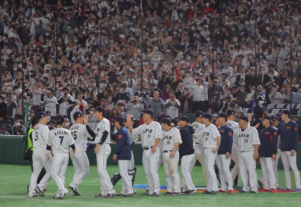 イタリアに勝利し準決勝進出を決めハイタッチする大谷翔平ら(C)日刊ゲンダイ