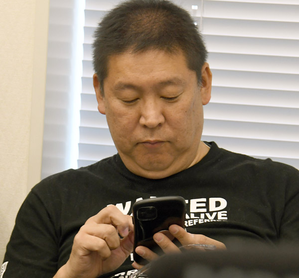 NHK党代表を辞任した立花孝志氏(現・政治家女子48党事務局長)はスマホいじって知らぬ振り(C)日刊ゲンダイ