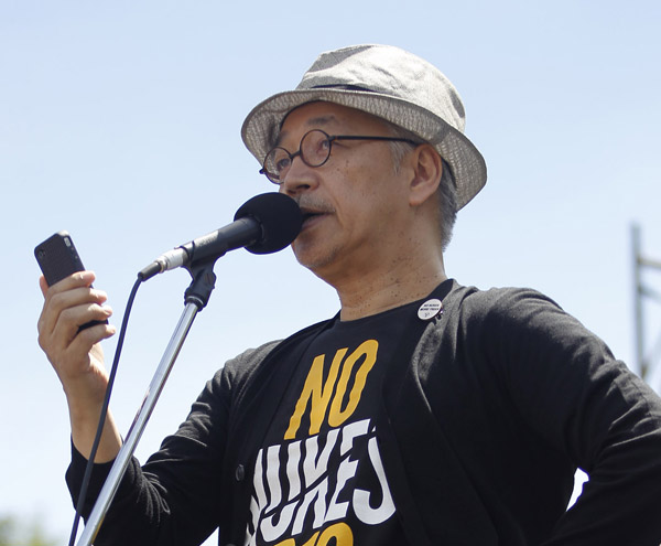 「さようなら原発10万人集会」でiPhone片手に挨拶する坂本龍一(2012年撮影)/(C)日刊ゲンダイ