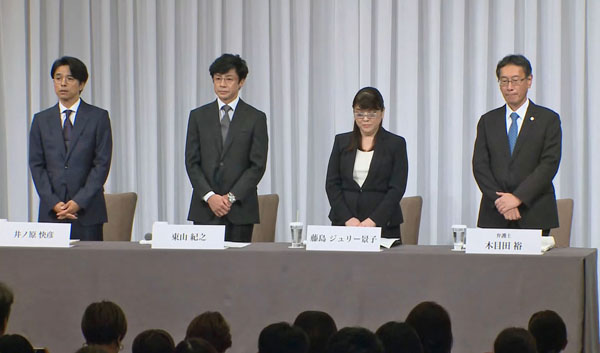 ジャニーズ事務所のジャニー喜多川氏による性加害問題で、記者会見に臨む(左から)井ノ原快彦氏、東山紀之氏、藤島ジュリー景子氏ら=7日午後(C)共同通信社