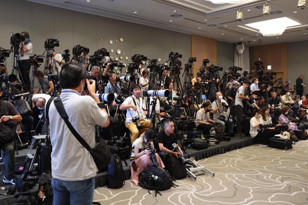 質問は1問だけ、撮影は移動禁止の正面のみと限定された(C)日刊ゲンダイ