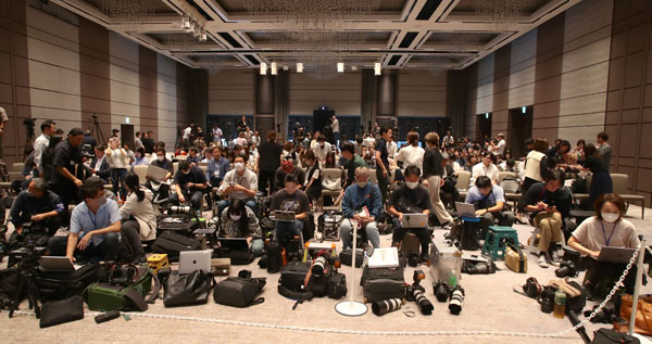 会場に集結する報道陣から拍手が…(C)日刊ゲンダイ
