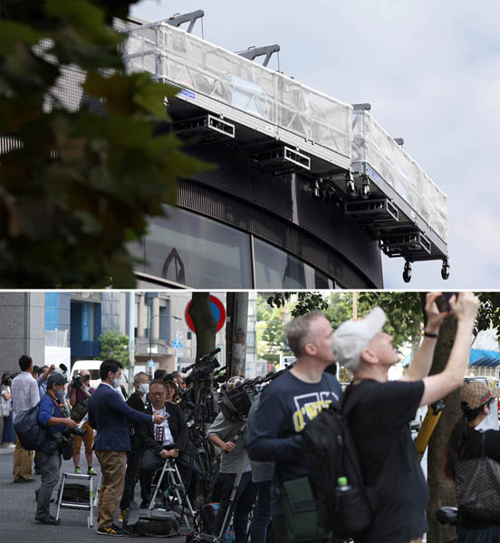 看板の撤去作業が始まったジャニーズ事務所(上)の前に集結する報道陣(C)日刊ゲンダイ
