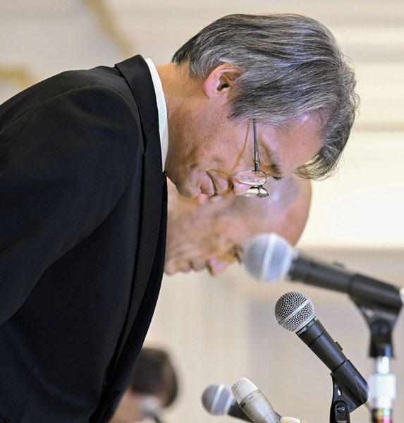 記者会見し遺族に謝罪する木場健之理事長(C)共同通信社