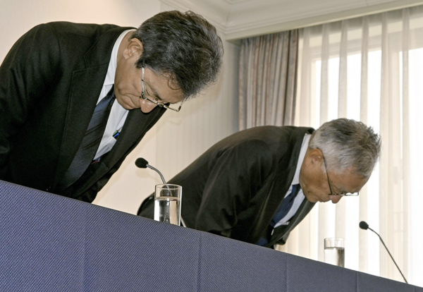 記者会見で謝罪する日本海テレビの田口晃也代表取締役会長(奥)ら(C)共同通信社