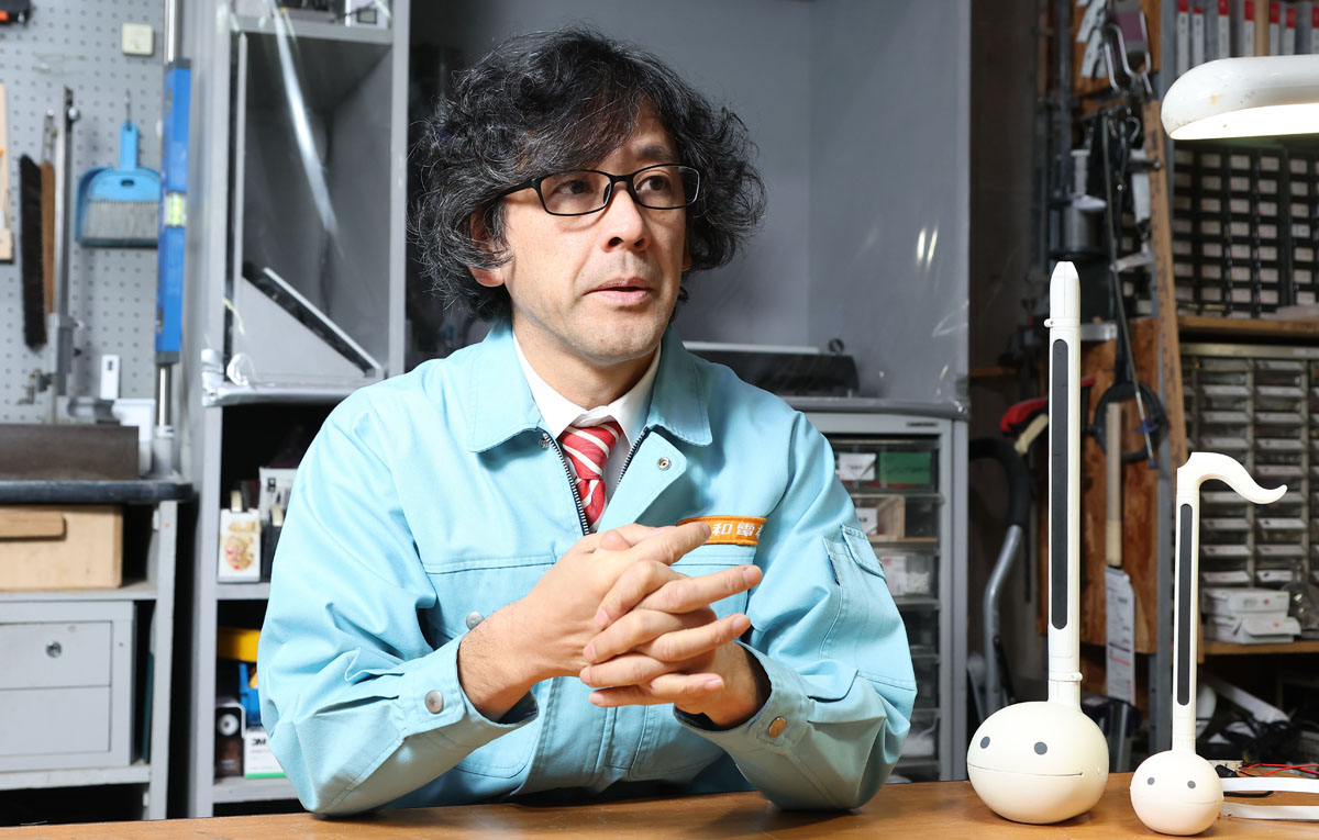 明和電機の土佐信道氏。右にあるのが音符の形の電子機器「オタマトーン」/(C)日刊ゲンダイ