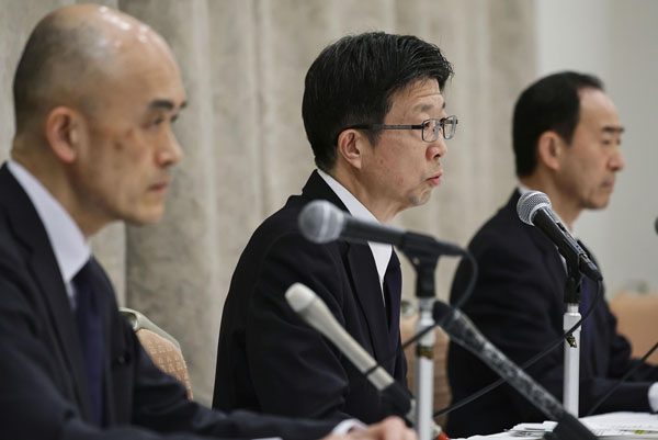 昨28日、謝罪会見をした(左から)宝塚歌劇団の村上浩爾理事長、阪急阪神HDの嶋田泰夫社長と大塚順一執行役員(C)共同通信社