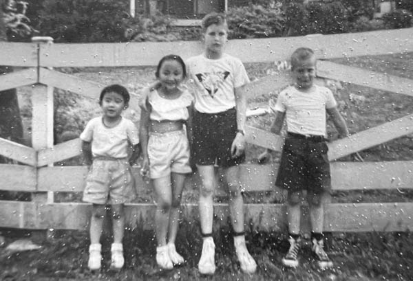 アメリカの自宅裏で姉たちと(石田少年は左)/(提供写真)