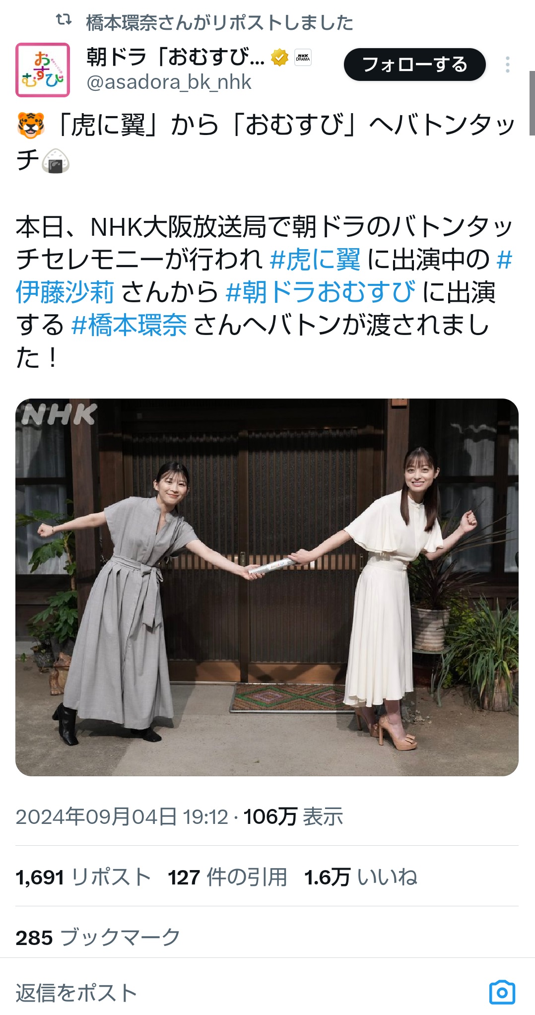 「おむすび」で指摘される橋本環奈の「クマ」の変遷を公式Xの写真でたどる 5月はゲッソリ、10月はスッキリ