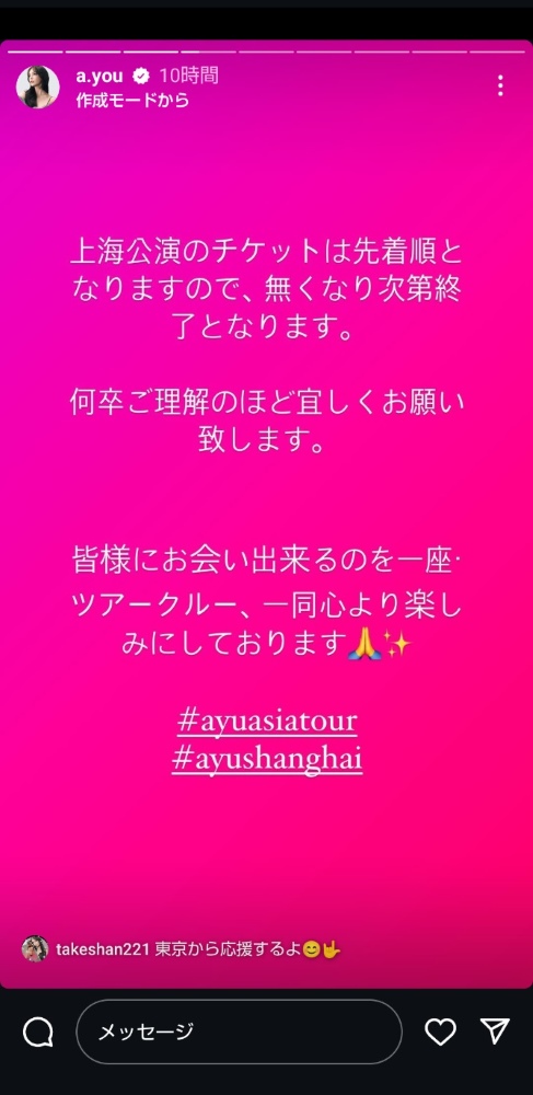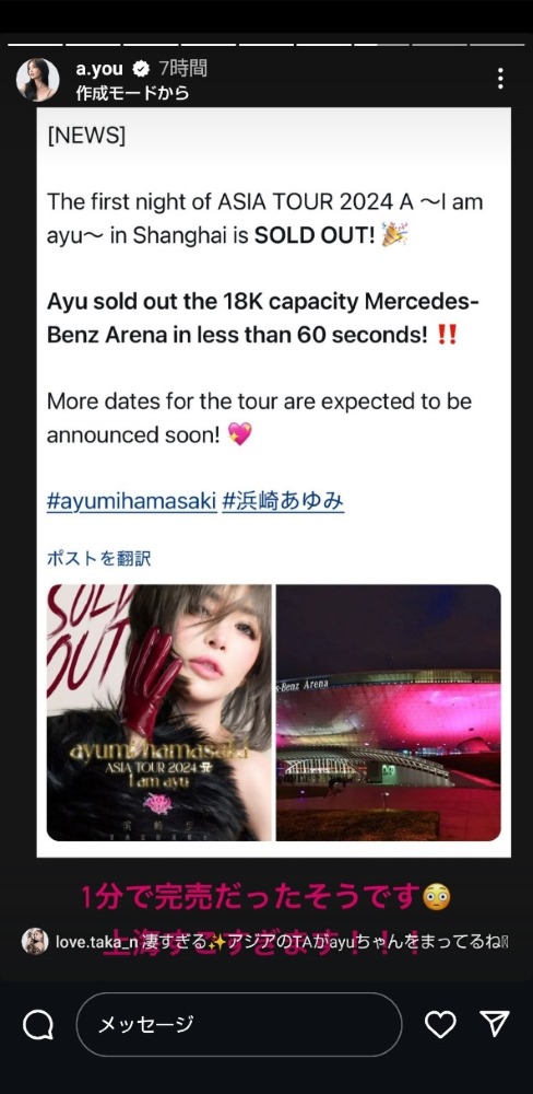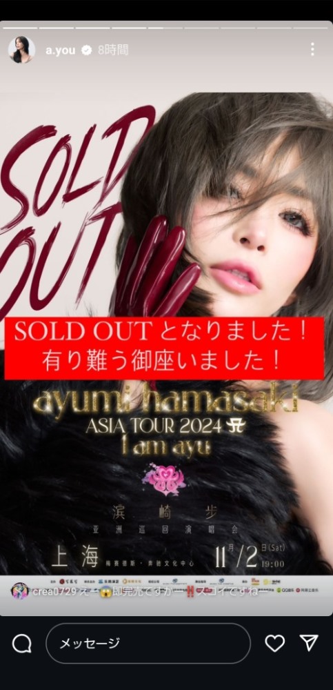 チケット完売を報告する浜崎あゆみ(本人のインスタグラムのストーリーズ)