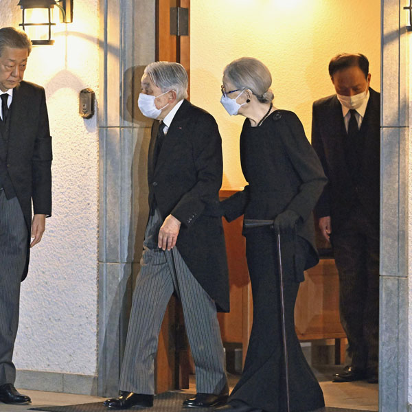 三笠宮妃百合子さまの通夜の前に宮邸を弔問された上皇ご夫妻=24日午後、東京・元赤坂の赤坂御用地(代表撮影)