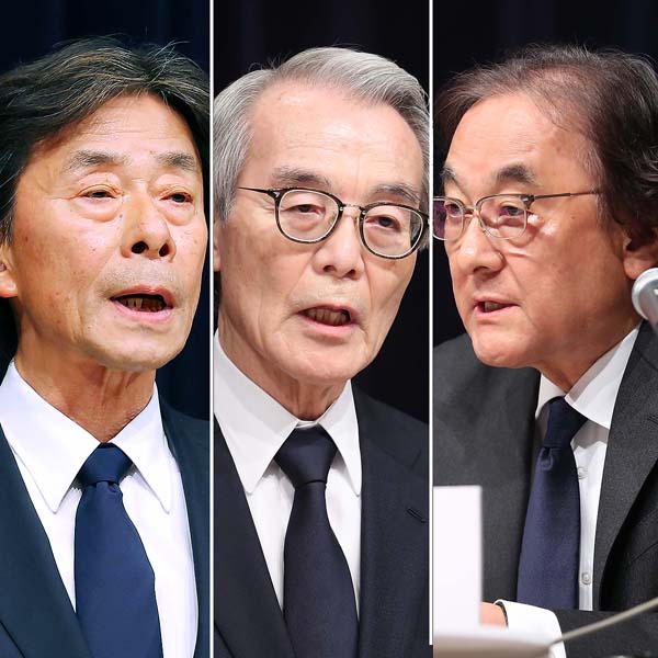 まさかの報道使命を否定する会見後のやり直し会見は、まるで人権侵害は深刻な罪だと知らないかにょうな話しぶり(左から、辞任したフジテレビ港社長と嘉納会長、右はフジ・メディアHDの金光会長)/(C)日刊ゲンダイ