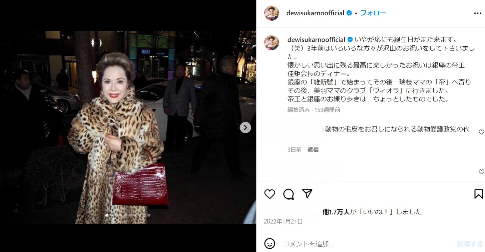 デヴィ夫人「動物愛護」政党に疑問の声…過去の毛皮コート事件とワニ革バッグコーデが物議