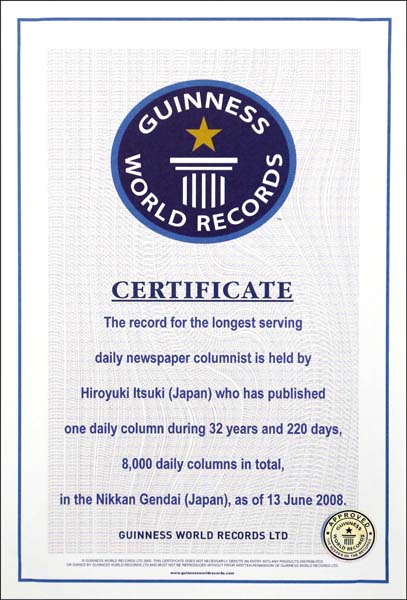 2008年6月13日「流されゆく日々」連載8000回ギネス世界記録認定証。現在もギネス記録更新中(C)日刊ゲンダイ
