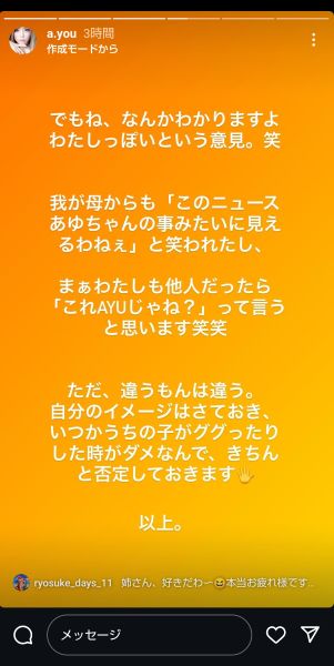 ウワサを否定する浜崎あゆみのメッセージ(本人のインスタグラムから)