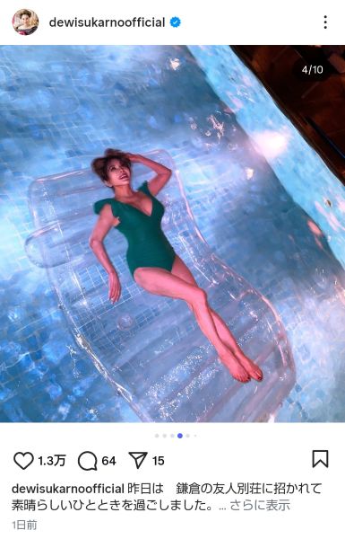 緑色水着に持を包むデヴィ夫人(本人のインスタグラムから)